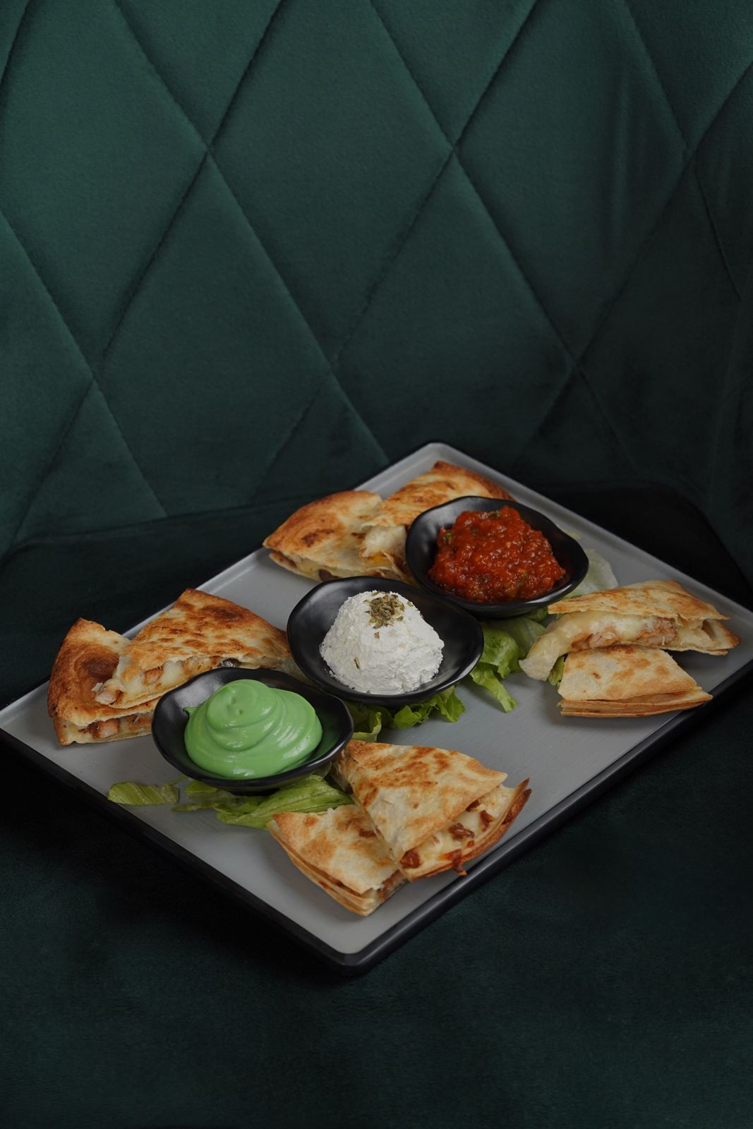 Tortilla bread, pico de gallo, olive, chicken, cheddar and mozzarella cheese and sour cream