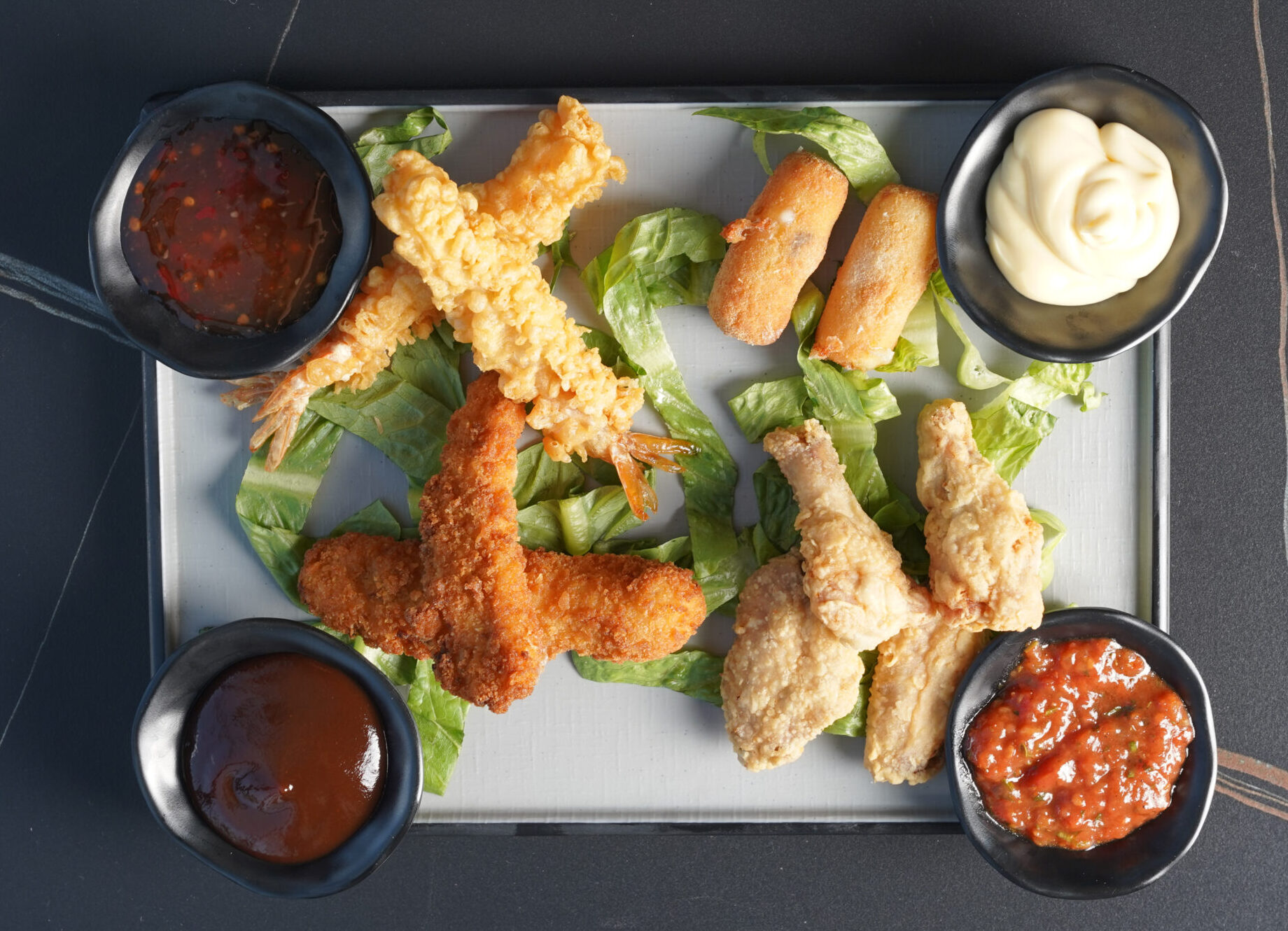Tempura shrimps, wings, mozzarella sticks, chicken strips